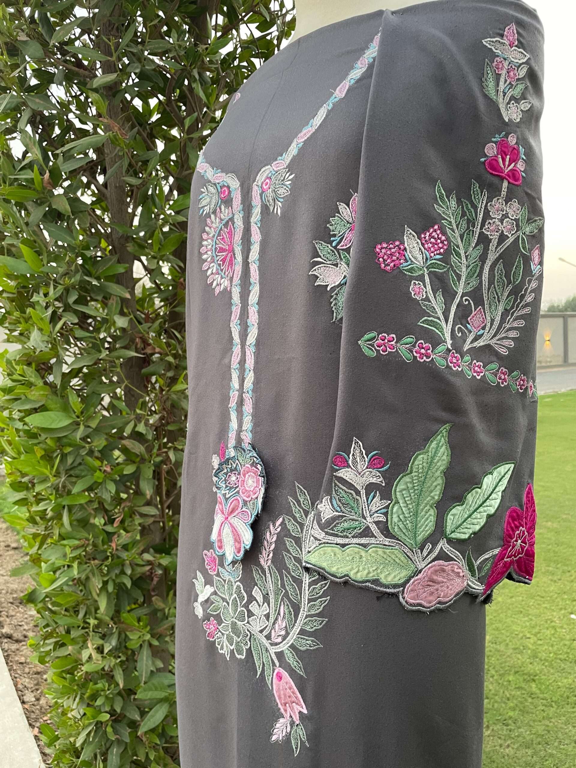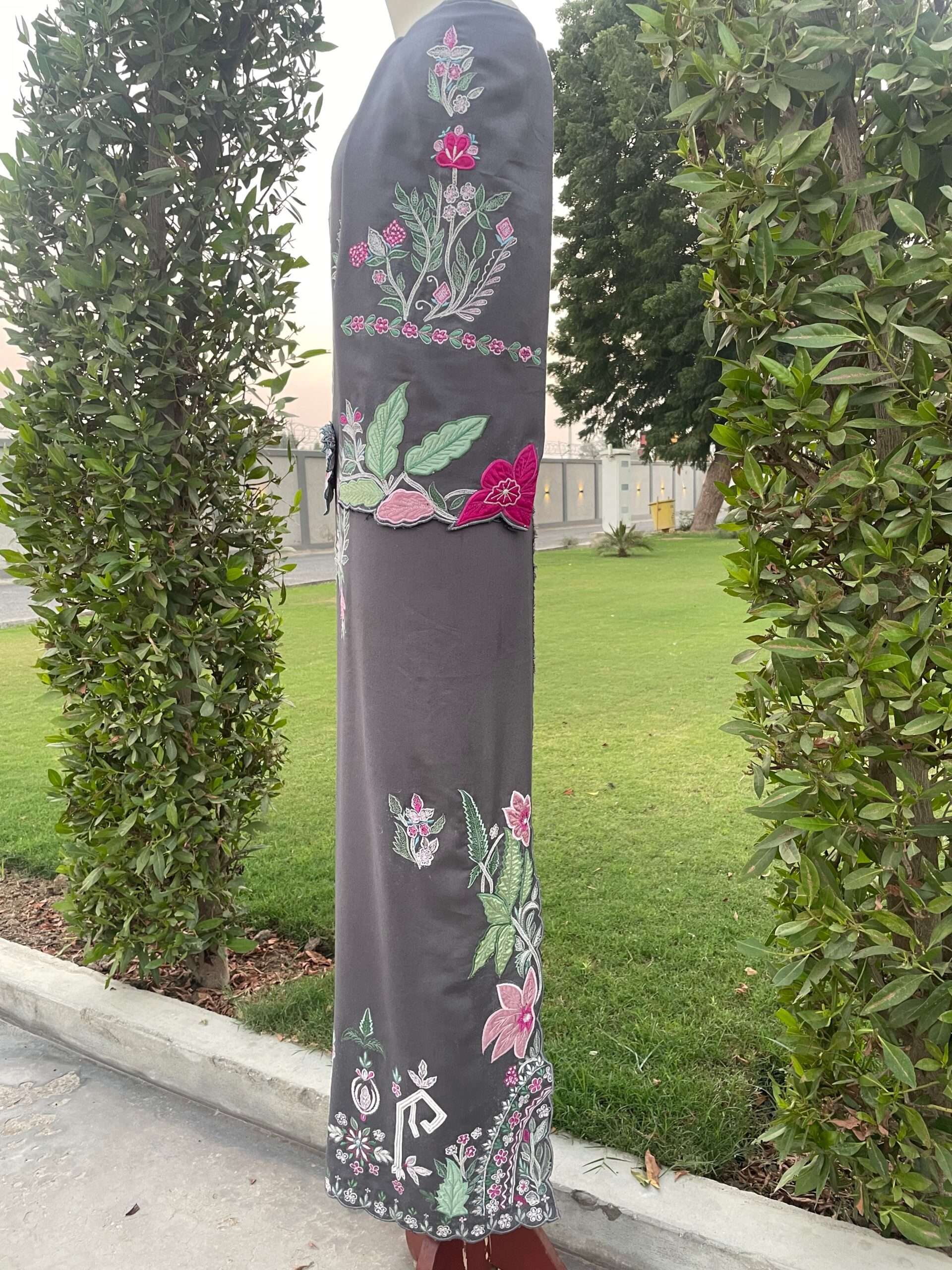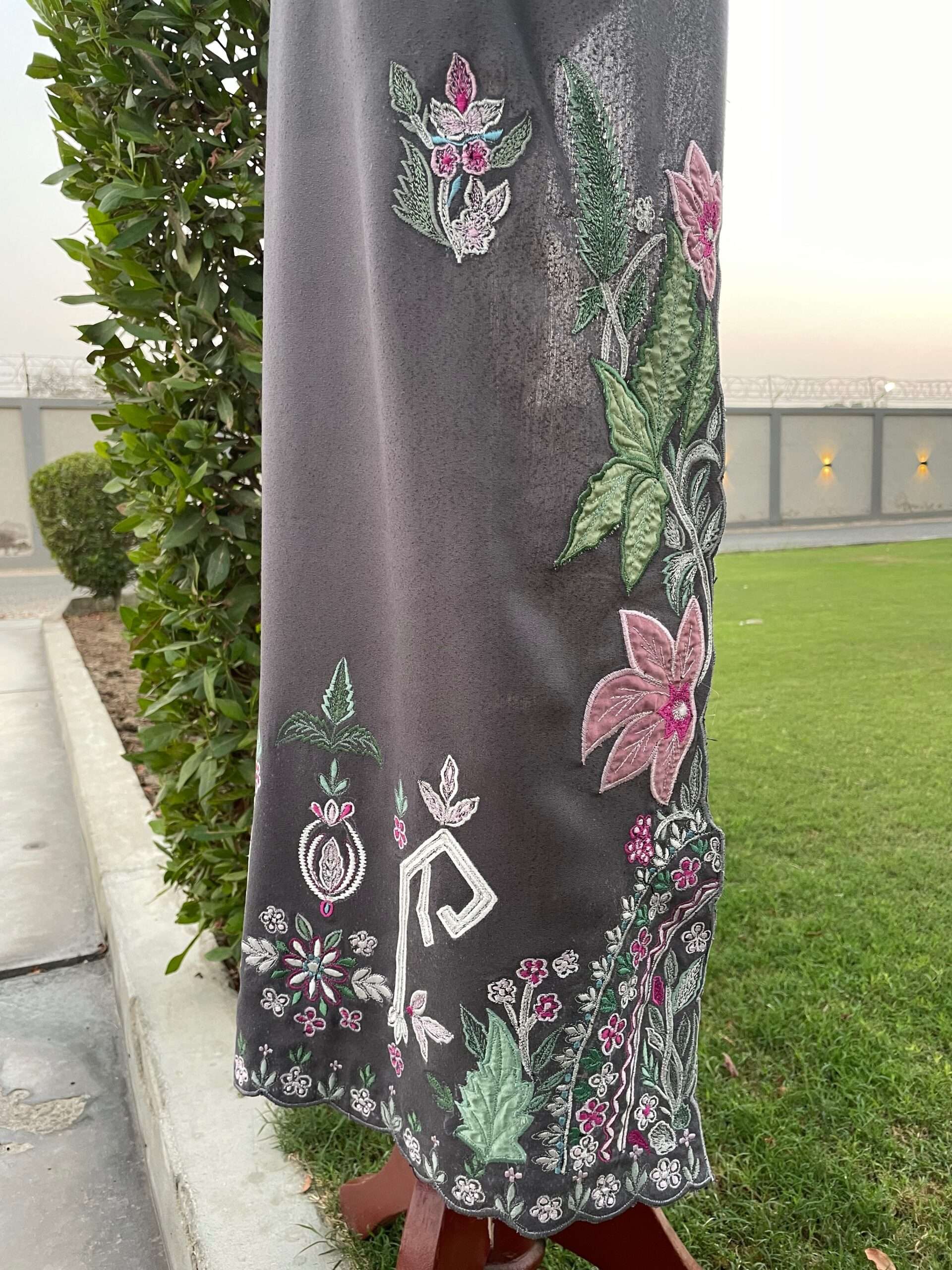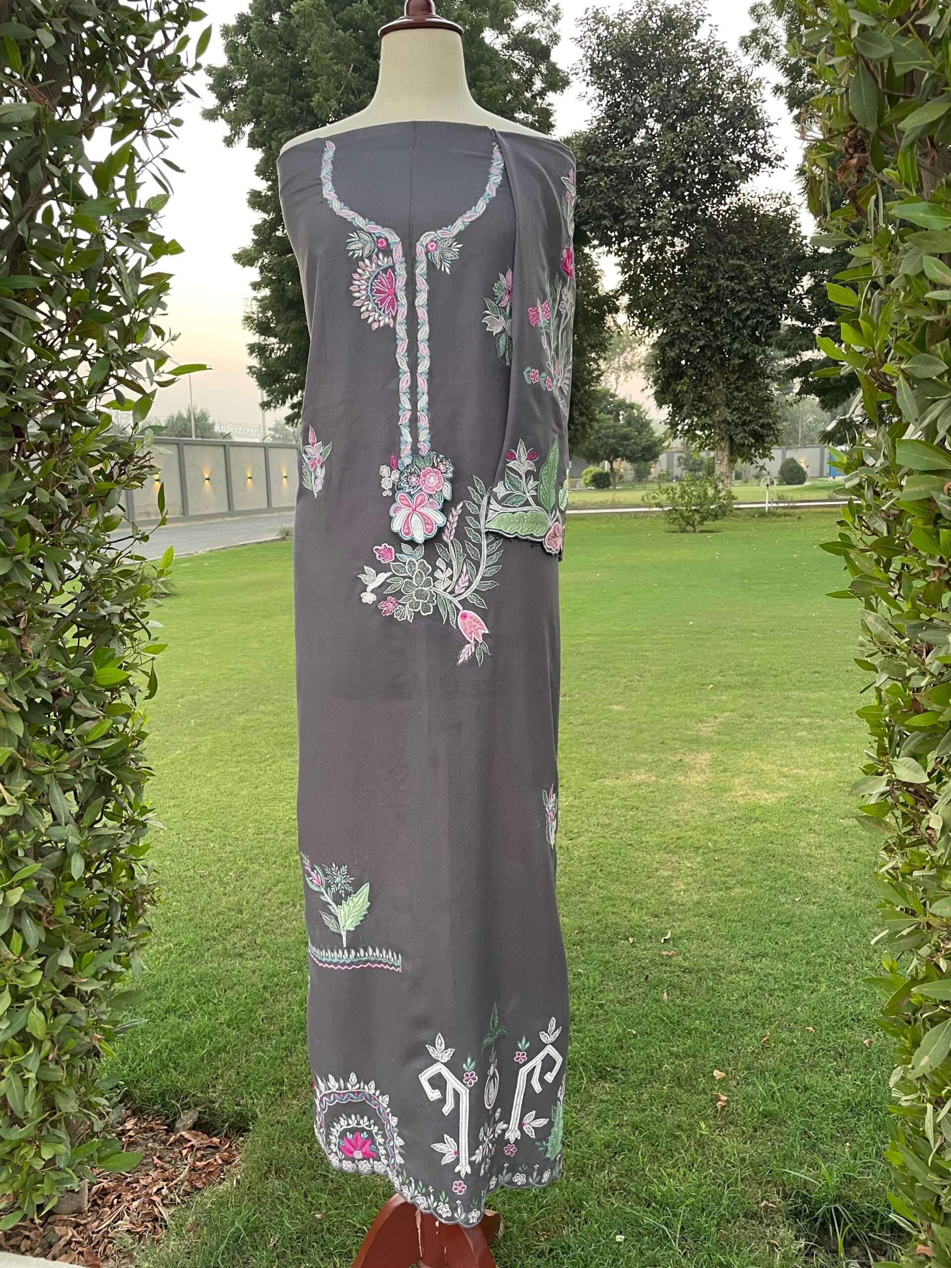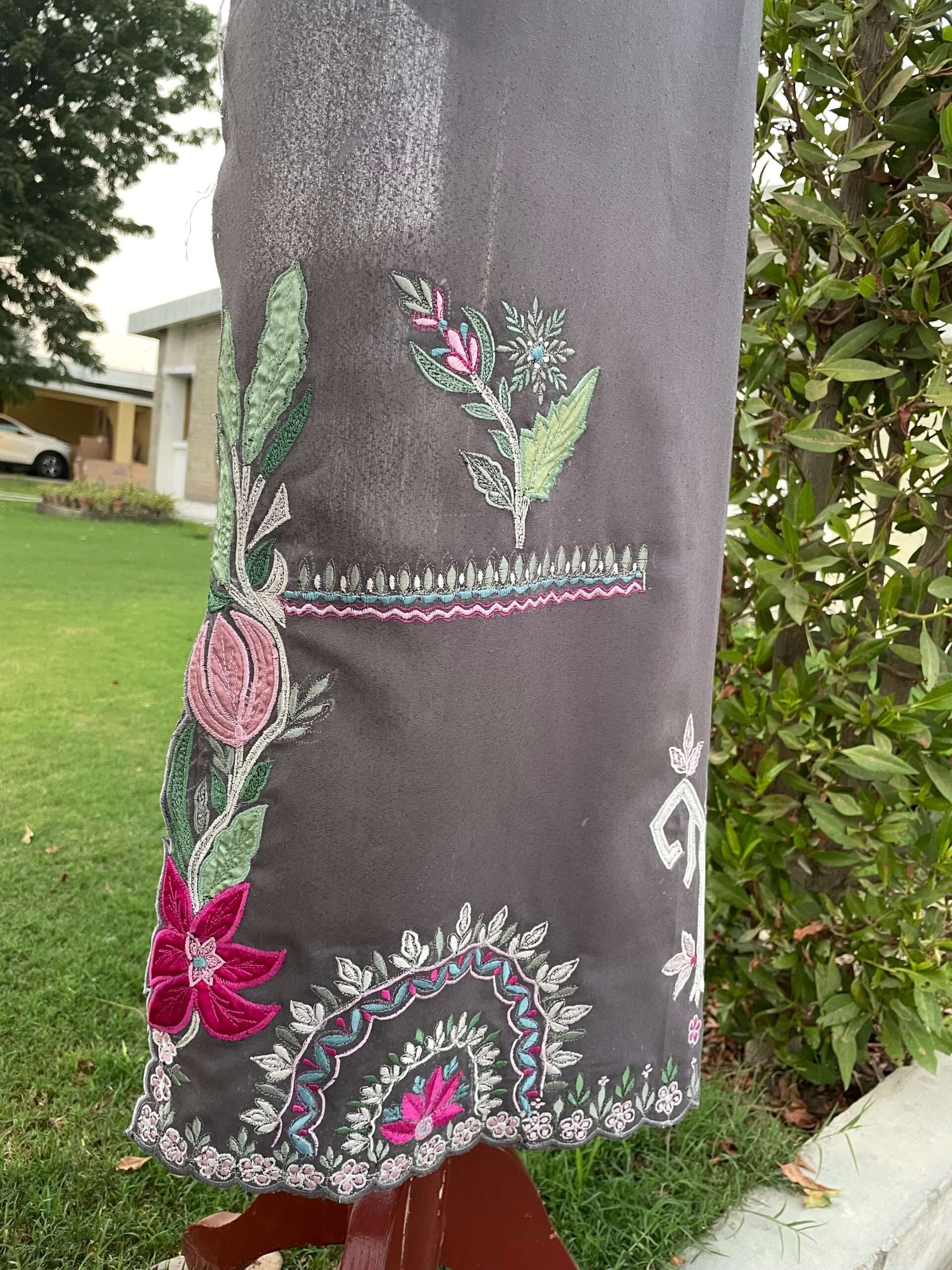 This Karandi embroidered suit features a premium Karandi fabric shirt with intricate front and sleeves embroidery and Applique Work. The rich texture and breathable feel of Karandi fabric offer both comfort and elegance, making this designer Karandi suit perfect for festive wear, formal events, and special occasions.