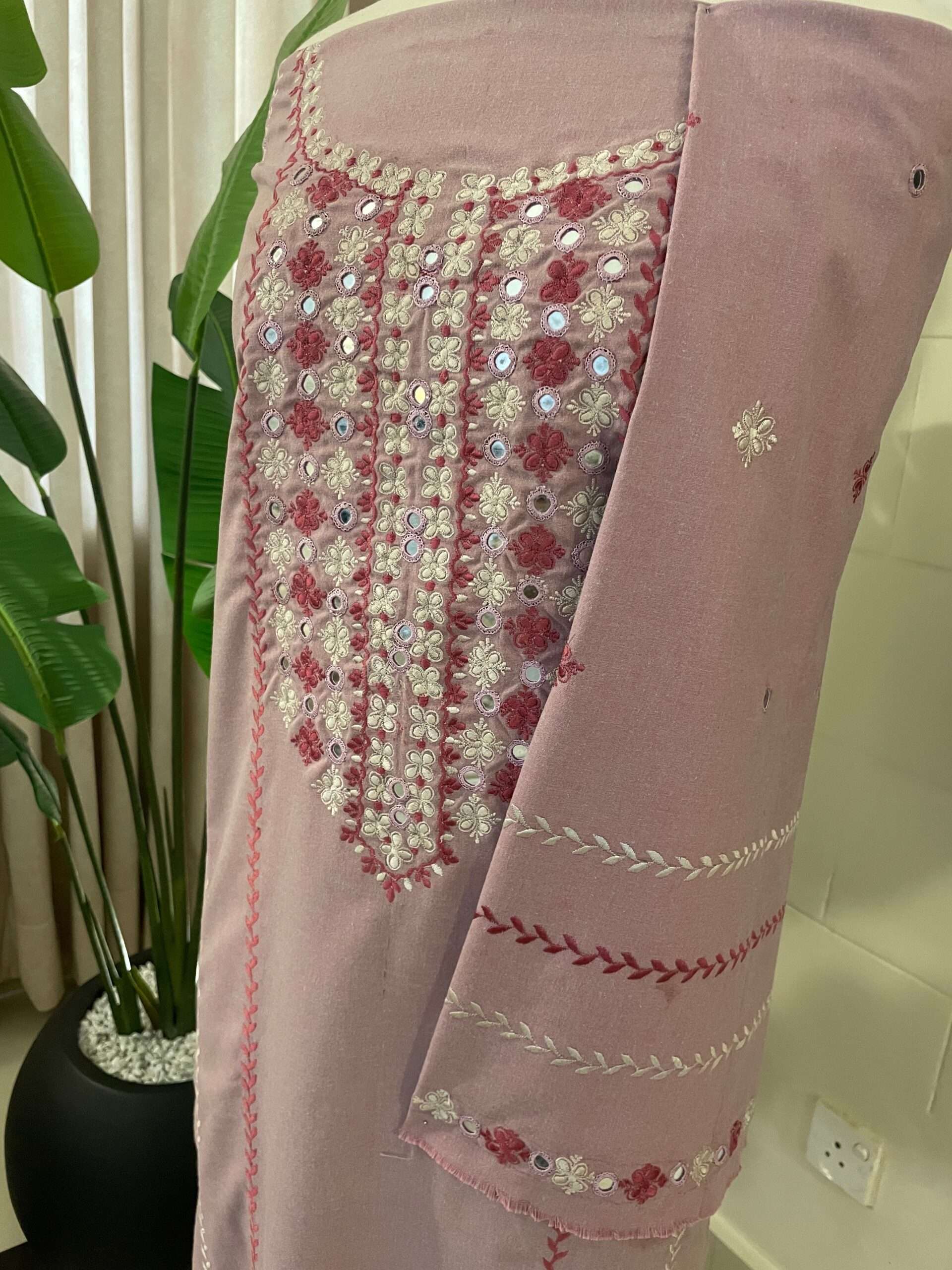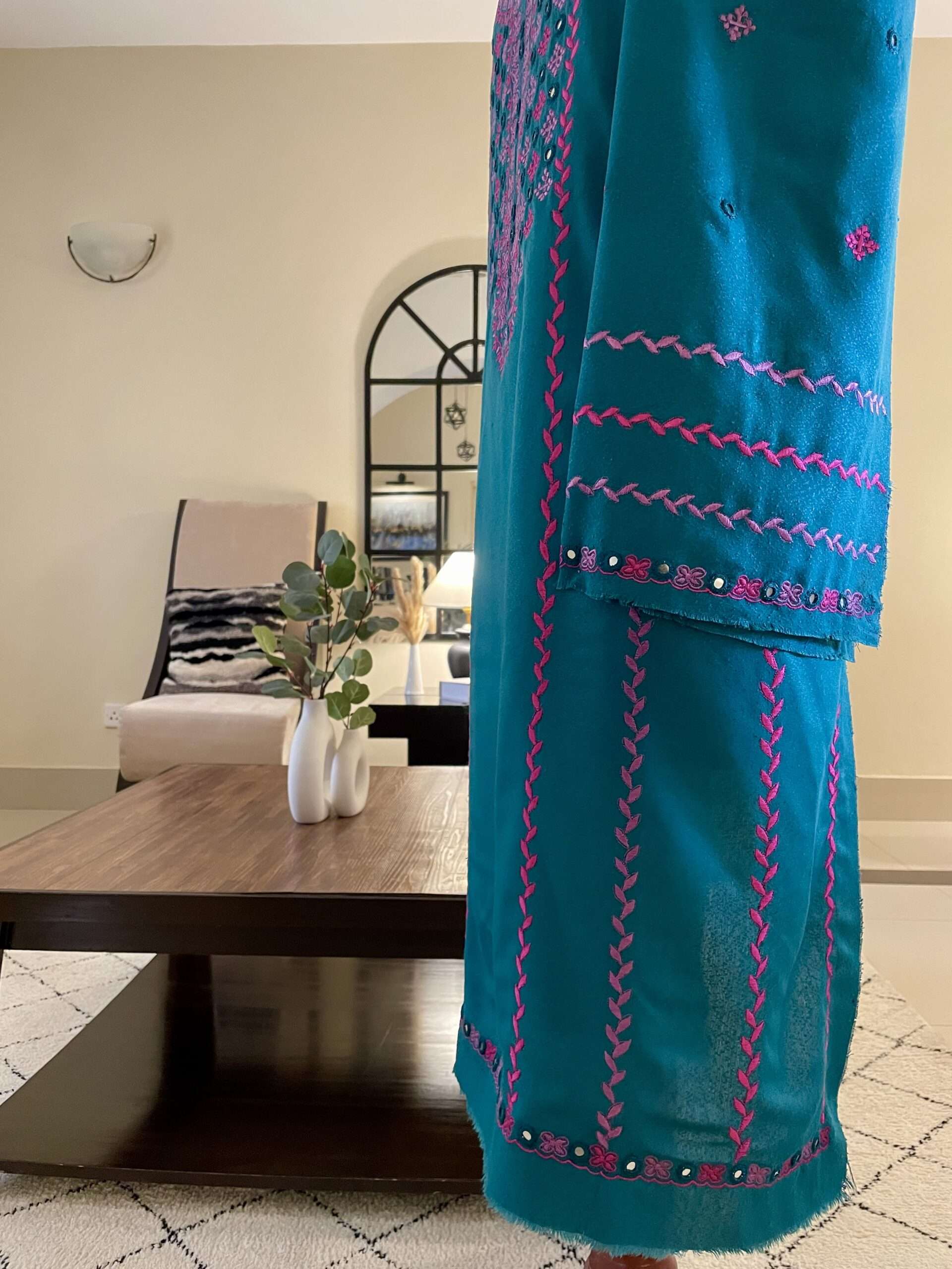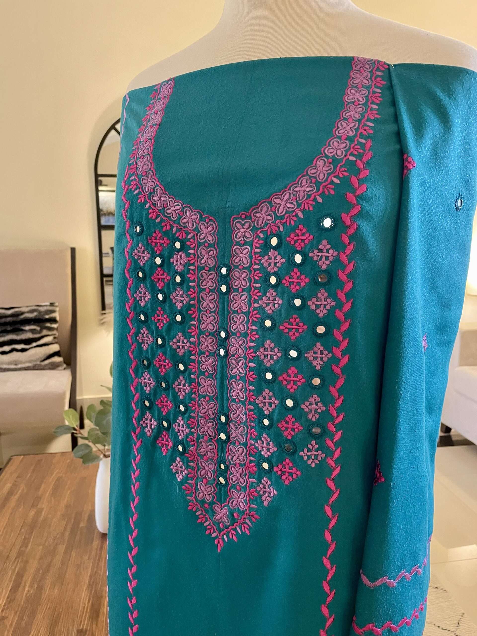 This Karandi embroidered suit features a premium Karandi fabric shirt with intricate front and sleeves embroidery, enhanced with delicate hand-embroidered mirror work. The rich texture and breathable feel of Karandi fabric offer both comfort and elegance, making this designer Karandi suit perfect for festive wear, formal events, and special occasions.